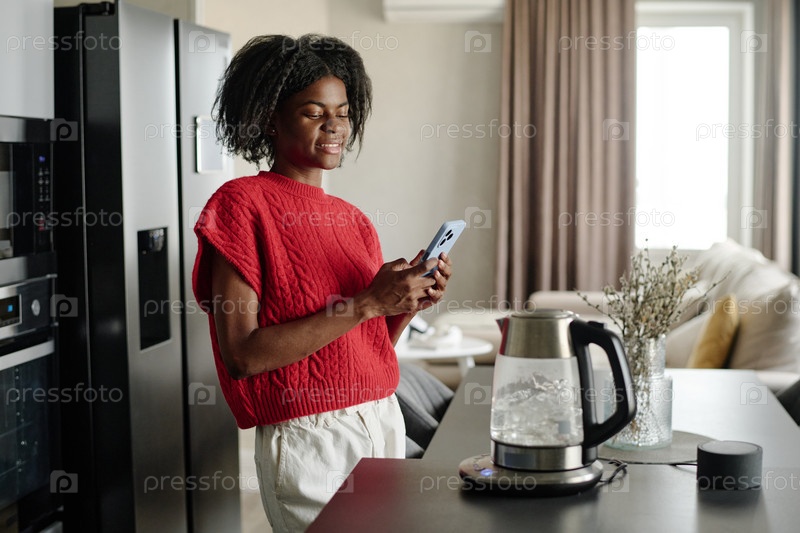 Женщина отправляет сообщения в социальную сеть, ожидая чаю