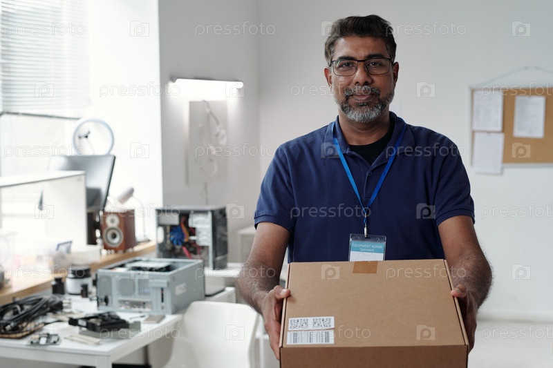 Портрет мужчины, держащего картонную коробку в офисной обстановке
