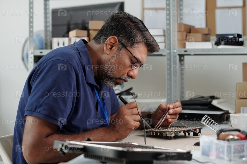 Опытный техник, ремонтирующий электронное устройство в мастерской
