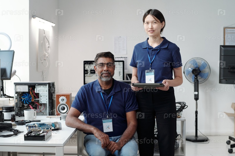 Улыбающиеся коллеги, сотрудничающие в технологическом проекте
