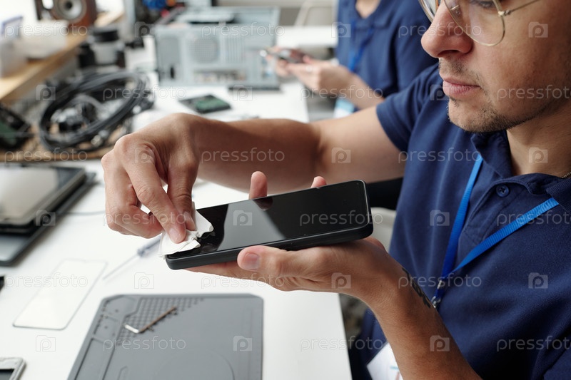 Техник убирает экран смартфона в конфигурации ремонтной мастерской
