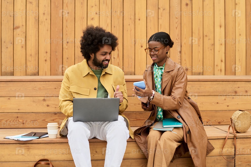 Сотрудничество и обмен идеями на открытом воздухе на деревянной скамейке