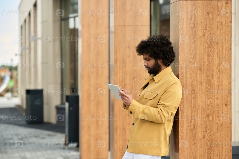 Концентрирующийся офисный работник в повседневной одежде с использованием планшета