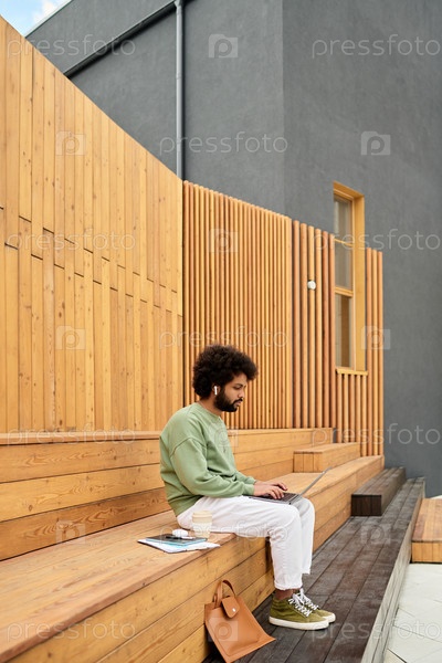 Сидя на улице, слушая музыку на деревянных лестницах
