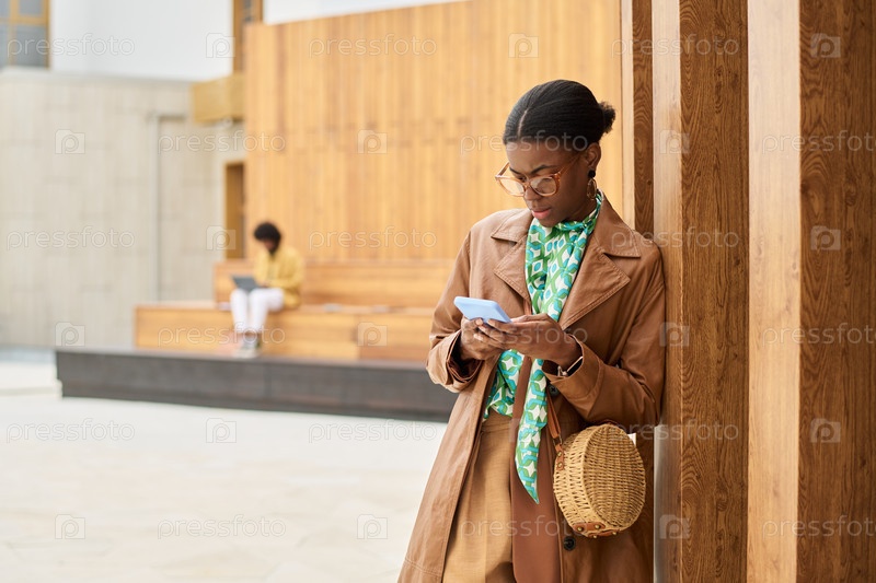 Женщина отправляет сообщения по телефону, стоя возле деревянной стены