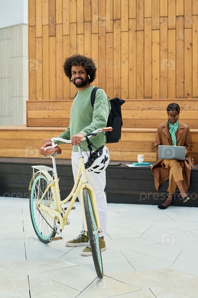 Улыбающийся мужчина стоит с велосипедом рядом со своим коллегой, работающим