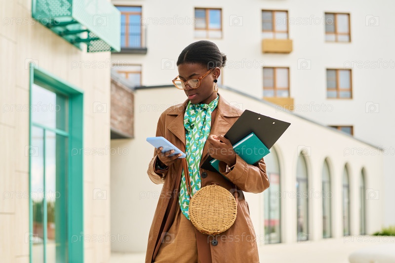 Деловая женщина, держащая документы и использующая смартфон