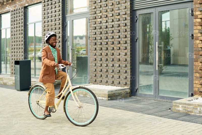 Улыбающийся мужчина едет на велосипеде рядом с современным зданием