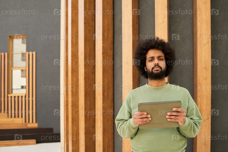 Портрет мужчины, держащего планшет на бамбуковом фоне