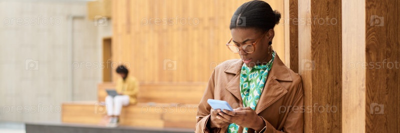 Женщина, использующая смартфон в современном помещенном пространстве