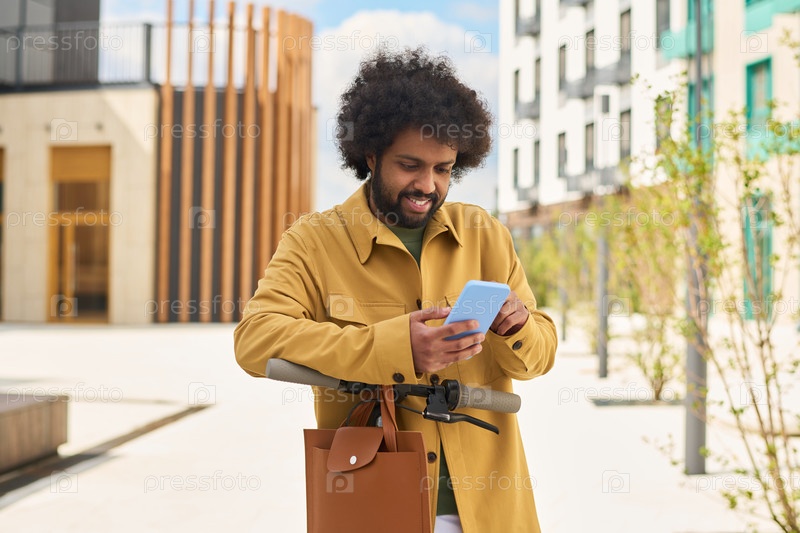 Улыбающийся мужчина держит смартфон, гуляя на улице