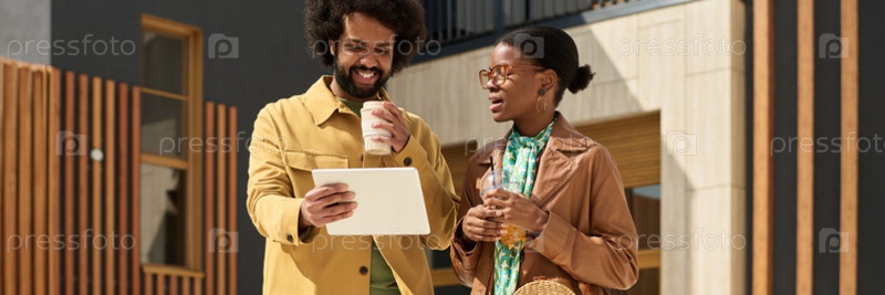 Улыбающиеся люди обсуждают планы с цифровым планшетом снаружи