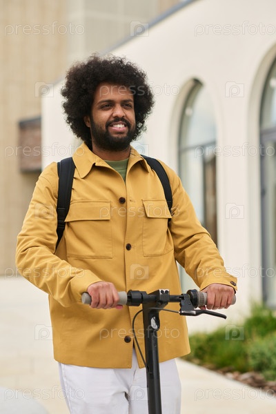 Улыбающийся мужчина едет на электрическом скутере за пределами современного здания
