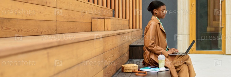 Побочный профиль женщины, печатающей на ноутбуке на открытом воздухе