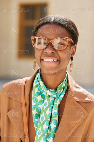 Улыбающаяся афроамериканская женщина, носящая очки на улице