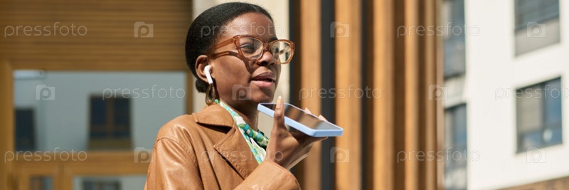 Афроамериканская женщина использует смартфон для голосовых сообщений