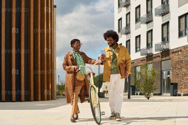Улыбающиеся профессионалы делятся телефоном на городской улице