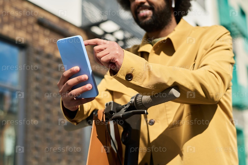 Запечатление улыбающегося мужчины, держащего смартфон в то время как он стоит