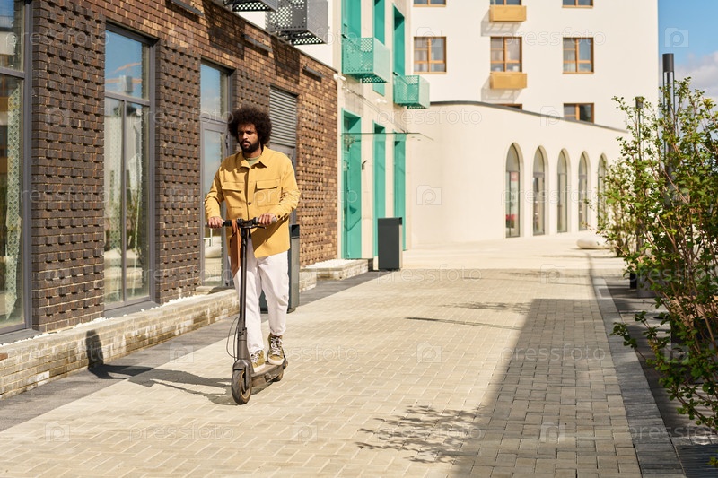 Человек едет на электрическом скутере на городской улице