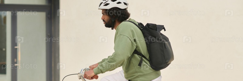 Мужчина, носящий шлем езда на велосипеде в открытом воздухе