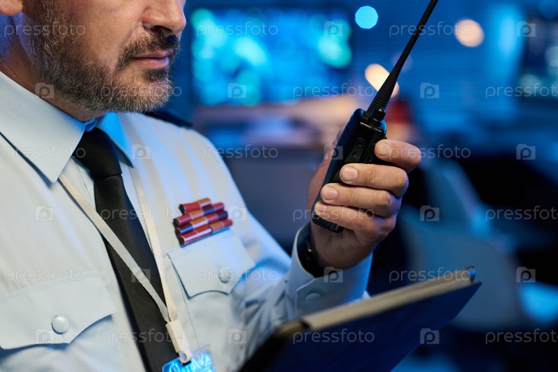 Офицер, держащий приемопередатчик и планшет