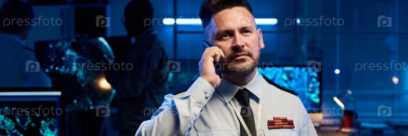 Зрелый офицер со смартфоном в ухе