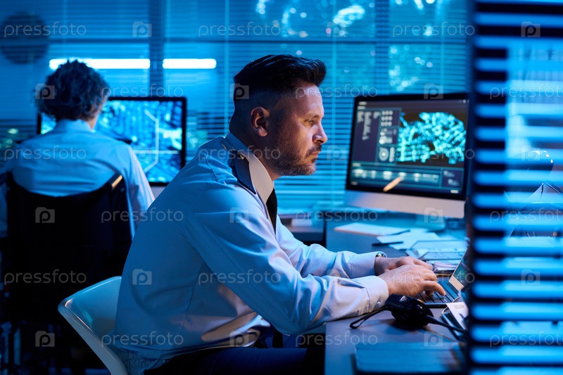 Мужчина смотрит на экран ноутбука и печатает