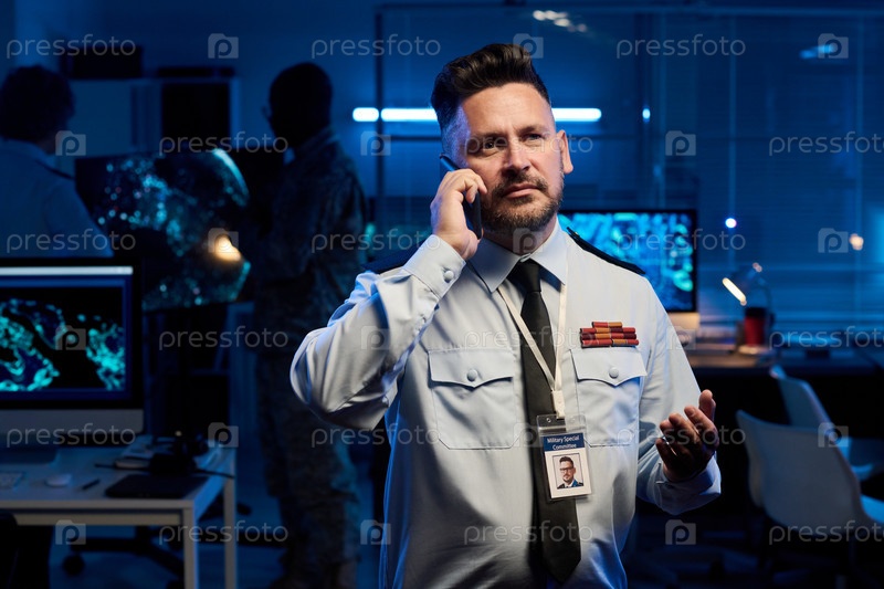 Офицер разговаривает по мобильному телефону