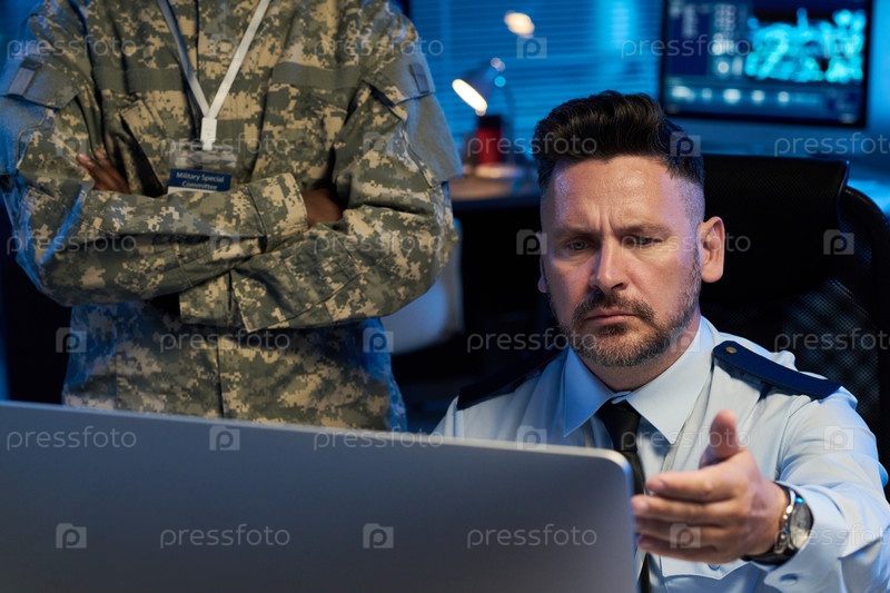 Серьезный мужчина-офицер смотрит на экран