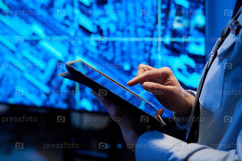 Офицер в форме указывает на экран