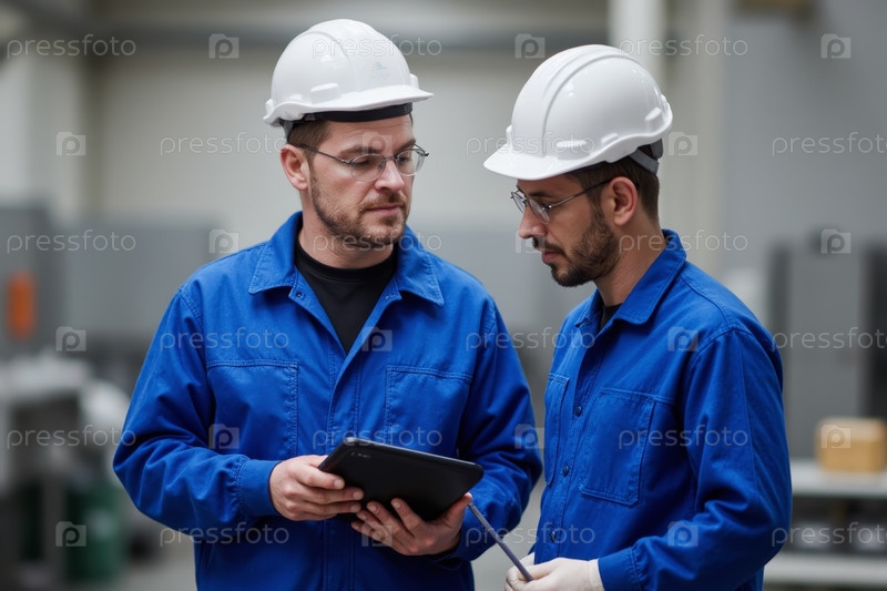 Два фабричных работника, использующих планшет на складе, проводят проверку