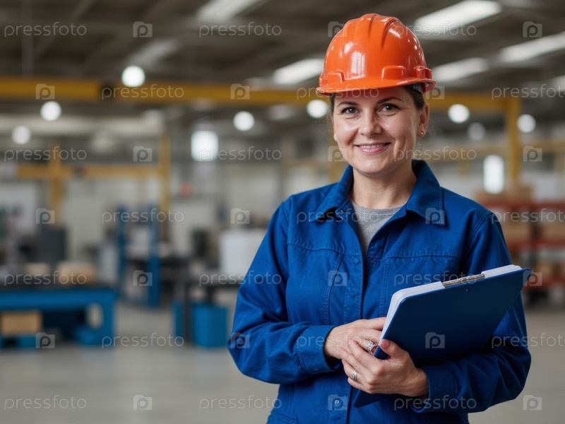 Улыбающаяся женщина Фабричный работник, держащий клипборд Контроль за производством