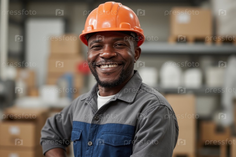 Улыбающийся чернокожий рабочий на фабрике в Хардхате в мастерской