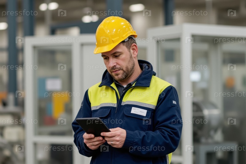 Работник фабрики, использующий планшетные операционные машины Мужчина