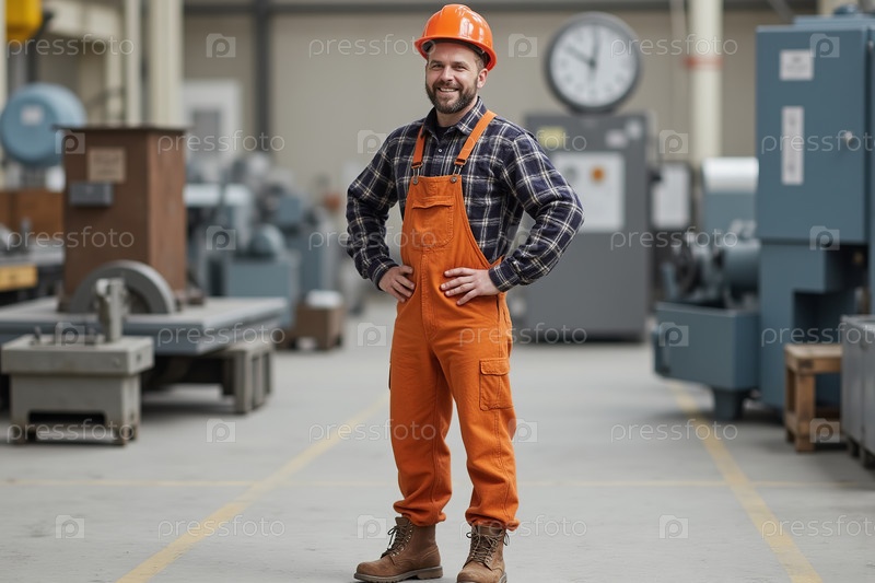 Улыбающийся мужчина Фабричный рабочий в Хардхате в промышленной мастерской