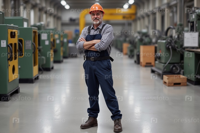 Зрелый мужчина Фабричный рабочий в Хардхате Стоящий в промышленной мастерской