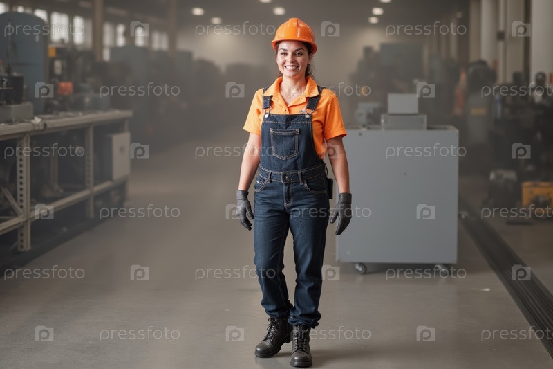 Улыбающаяся женщина Фабричный рабочий в Хардхате в паровой промышленной мастерской