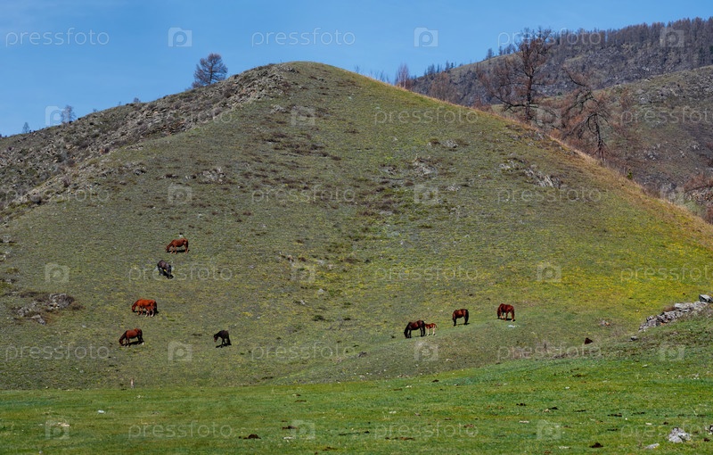 Россия. Юг Западной Сибири, Горный Алтай. Небольшой табун лошадей пасется на крутых склонах скалистых гор в районе поселка Онгудай