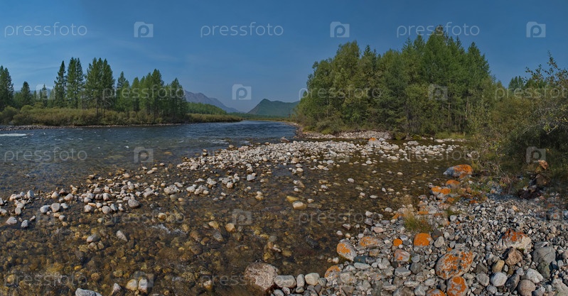 Россия. Западные Саяны. Панорамный вид каменистого берега горной реки Тисса
