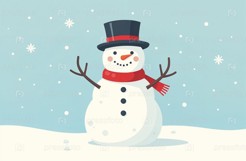 Снеговик в шапке и шарфе стоит в снежном лесу зимой, свободное место текст