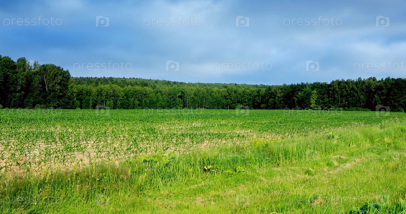 Сельскохозяйственное поле, засеянное кукурузой, лето 2023