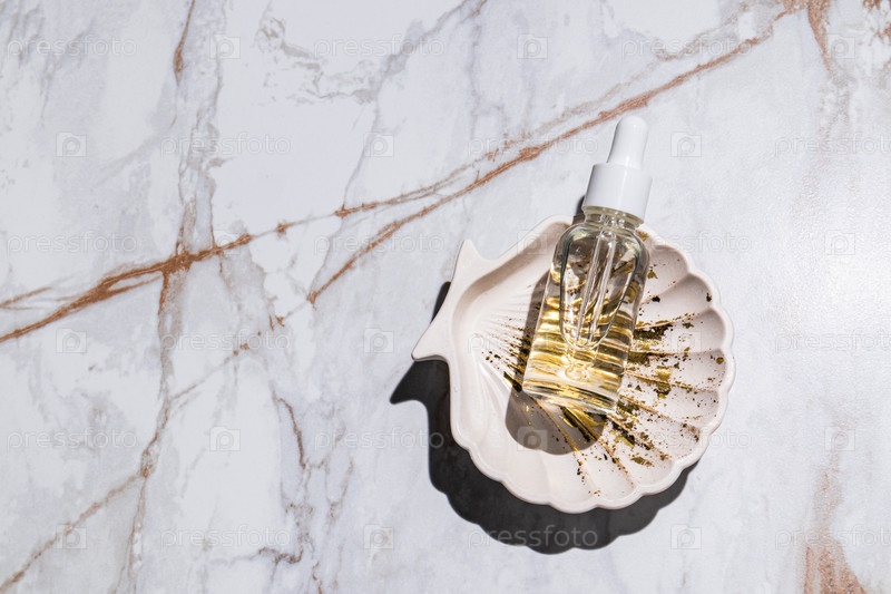 Прозрачный флакон с косметическим средством, маслом, сывороткой для ежедневного ухода за кожей лица на подносе в виде ракушки. мраморный фон. вид сверху
