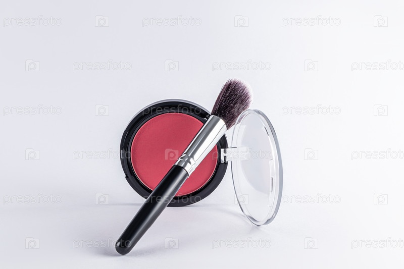 Красивая профессиональная черная кисть для макияжа опирается на открытую круглую упаковку с розовыми румянами. Вид спереди. белый фон. макет. реклама продукта