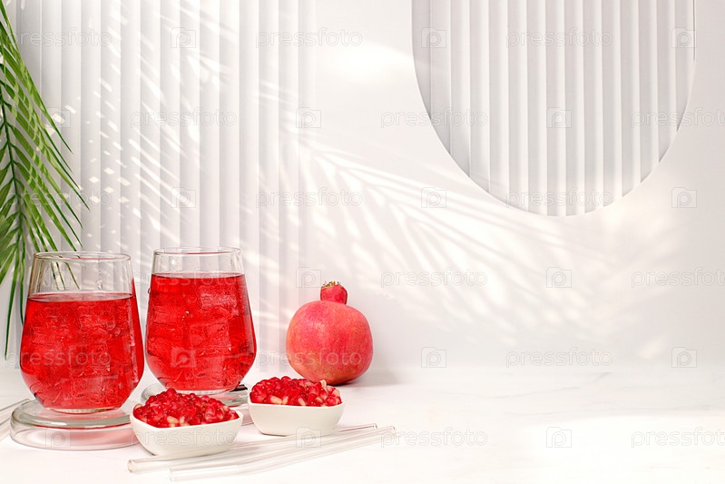 Гранатовый сок и ингредиенты, летний гранатовый напиток на ярком столе, детокс-диета и концепция потери веса, здоровая и натуральная пища, источник витамина С, селективный фокус, место для текста