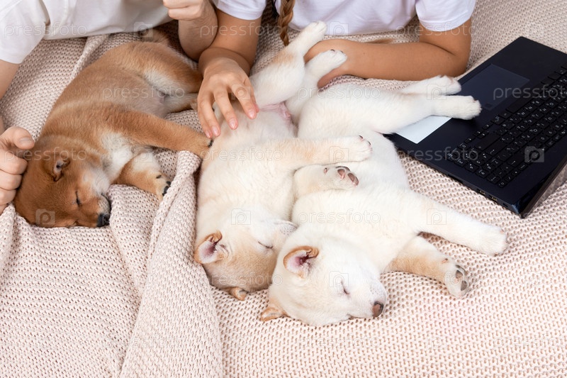 Девушка использует ноутбук и пьет кофе. Молодая женщина лежит на кровати со своей собакой дома