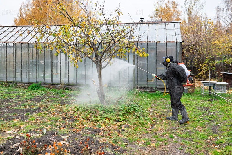 Мужчина в маске и комбинезоне опрыскивает сад средством от вредителей осенью