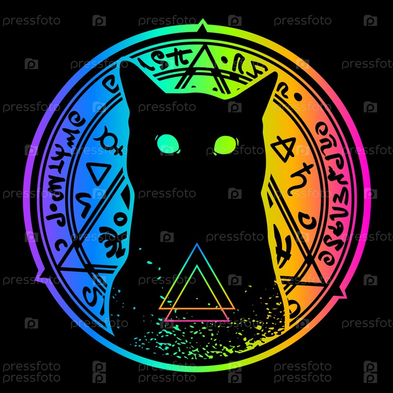 Черный силуэт кота на фоне разноцветных радужных алхимических надписей