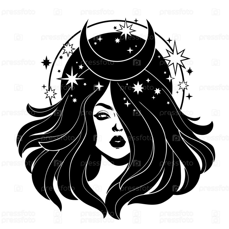 Красивая девушка с длинными волосами, украшенными звездами и луной