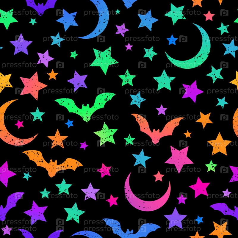 Бесшовный узор из разноцветных ярких летучих мышей, луны и звезд