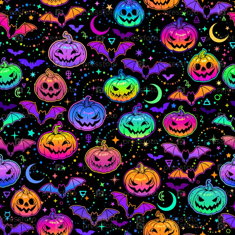 Бесшовный узор из ярких разноцветных тыкв и летучих мышей на Хэллоуин